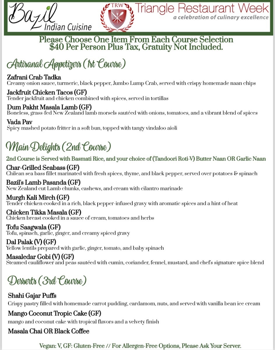 Welcome to Bazil Indian Cuisine, an exquisite culinary gem located in Raleigh, NC. Our menu is a tantalizing voyage through authentic Indian flavors, showcasing vibrant dishes that celebrate traditional recipes with a modern twist.