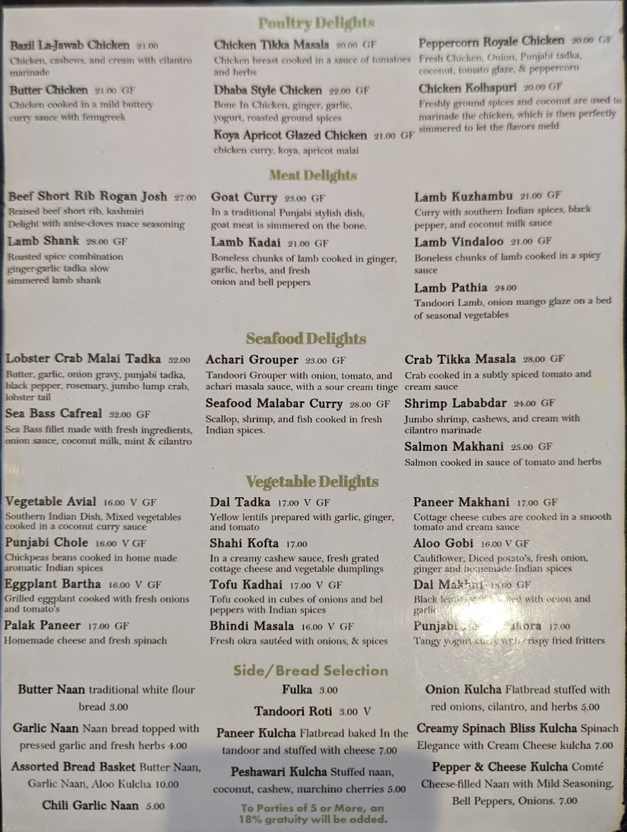 Dive into our Dinner Menu, where our Butter Chicken tantalizes with its rich, buttery curry infused with fenugreek, while the Dhaba Style Chicken entices with its robust blend of ginger and roasted spices. Vegetarian options, like our comforting Chicken Methi Malai, will leave you craving more.