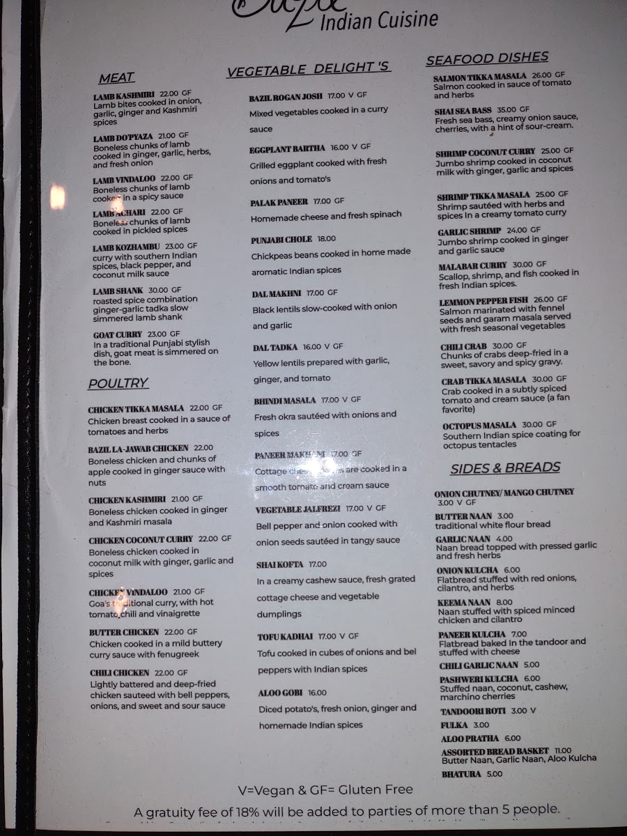 Tandoori chicken, salmon, lamb, shrimp, & seasonal vegetables. Gluten Free.